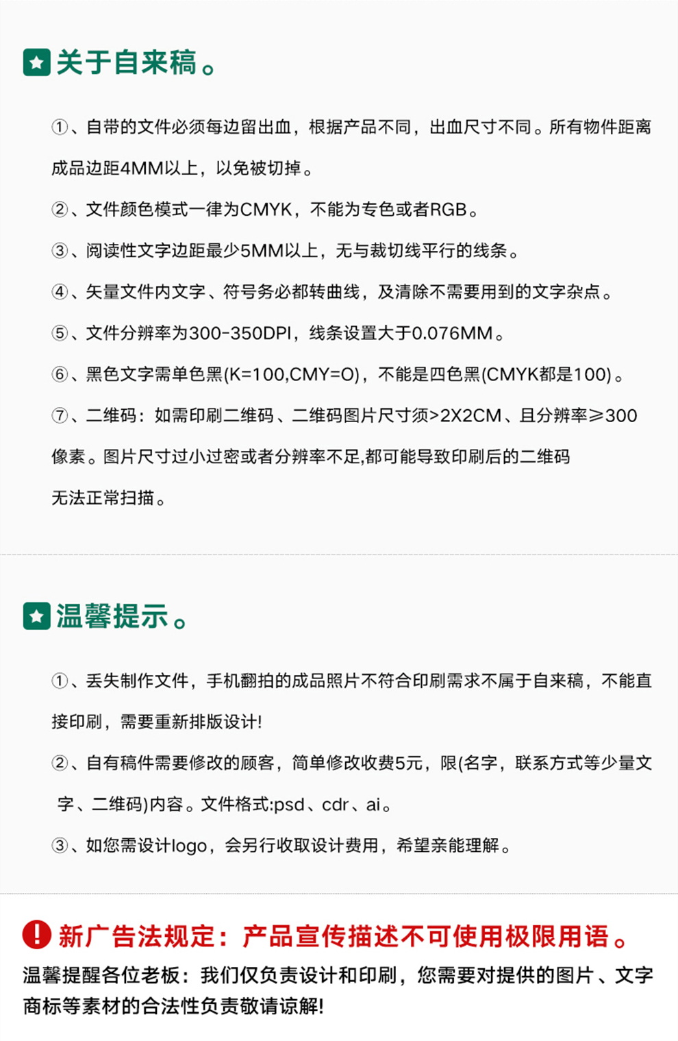 所有印刷品稿件審核無(wú)誤后(24小時(shí)內(nèi)),如有燙金、圓角、折頁(yè)、覆膜等后道工藝每增加一道下述時(shí)效就增加一天,下述時(shí)效不含定稿當(dāng)天